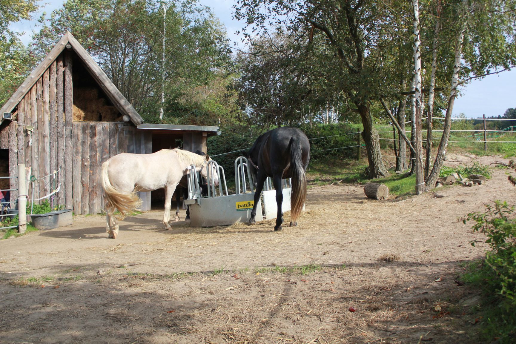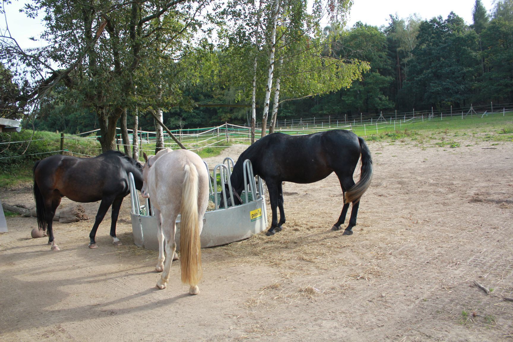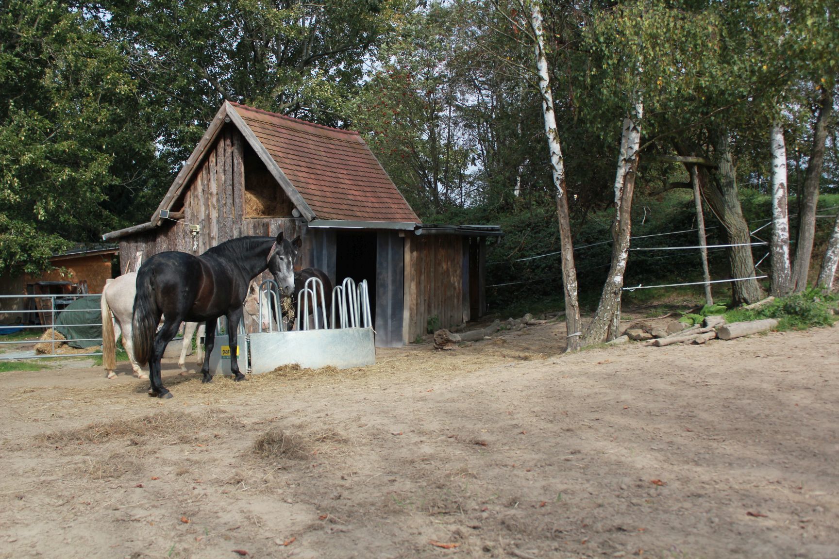 Unser Offenstall bietet zur Zeit Platz für 4 bis 6 Pferde in einer gemischten Gruppe (Stuten & Wallache). Die Pferde haben 24h Zugang zu Heu über eine Heuraufe und 2 große Heunetze. Diese sind so verteilt, dass auch rangniedrige Pferde zum Fressen kommen. Zusätzlich gibt es noch ein Sandwälzplatz. Ein neuer Offenstall mit Paddock trail ist in Planung.